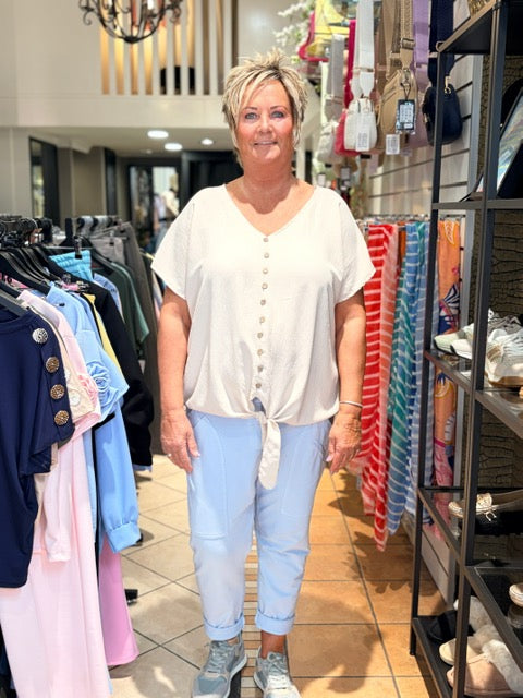 Leuke Blouse met knoopjes, maar dit model trek je over je hoofd aan. Het is een heel ruim model en heeft de looks van een ballonmodel.