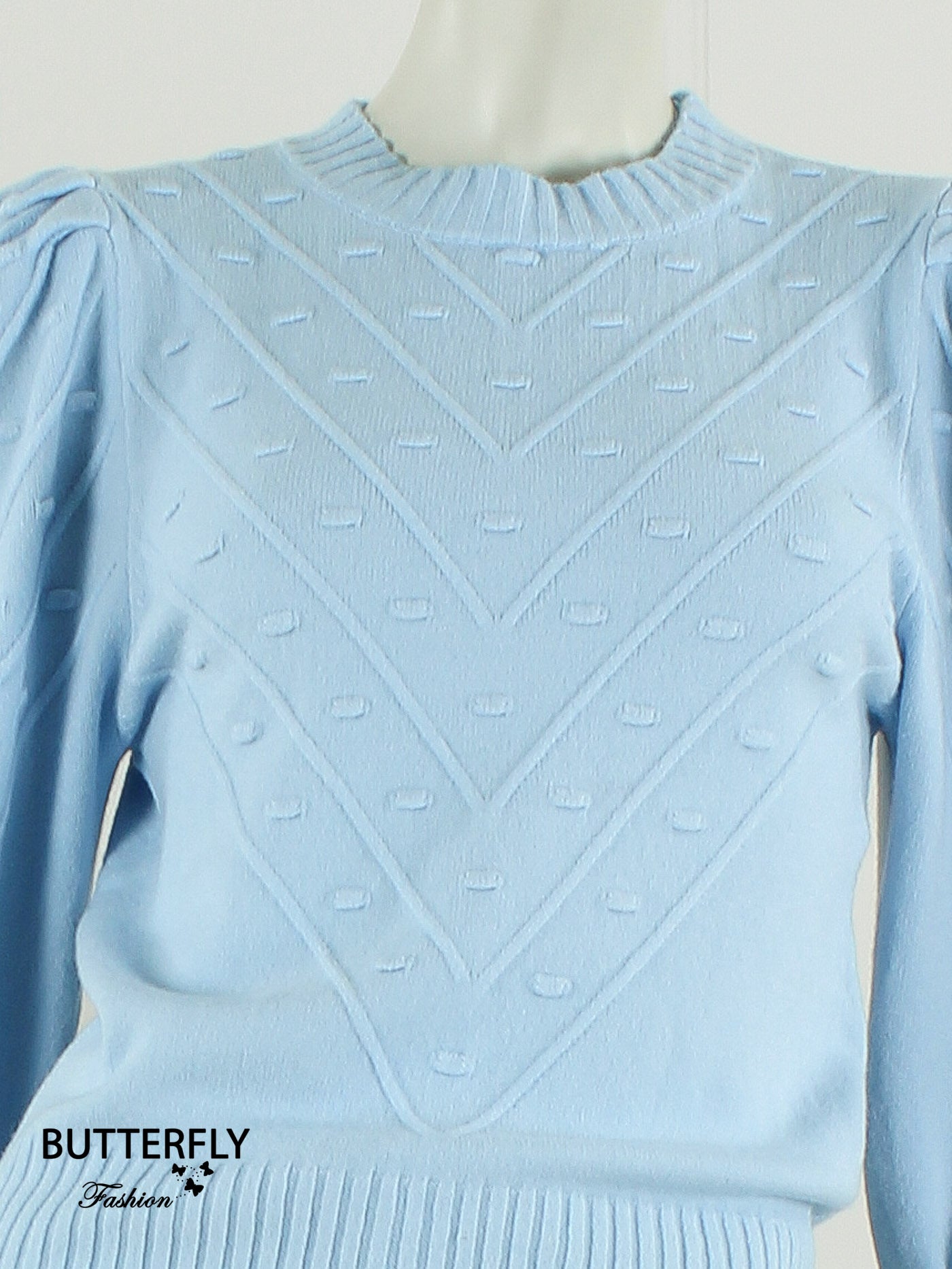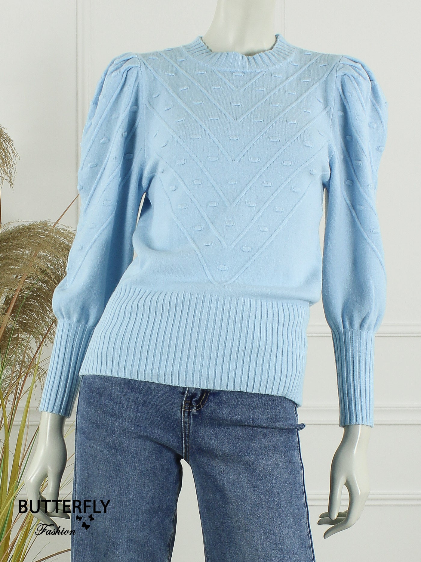 Top/trui in mooi zacht breisel met leuke pofmouw en ingebreid motief. Combineer haar met een mooie jeans.