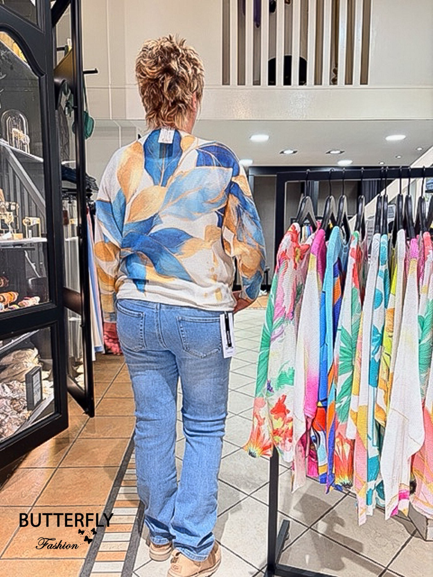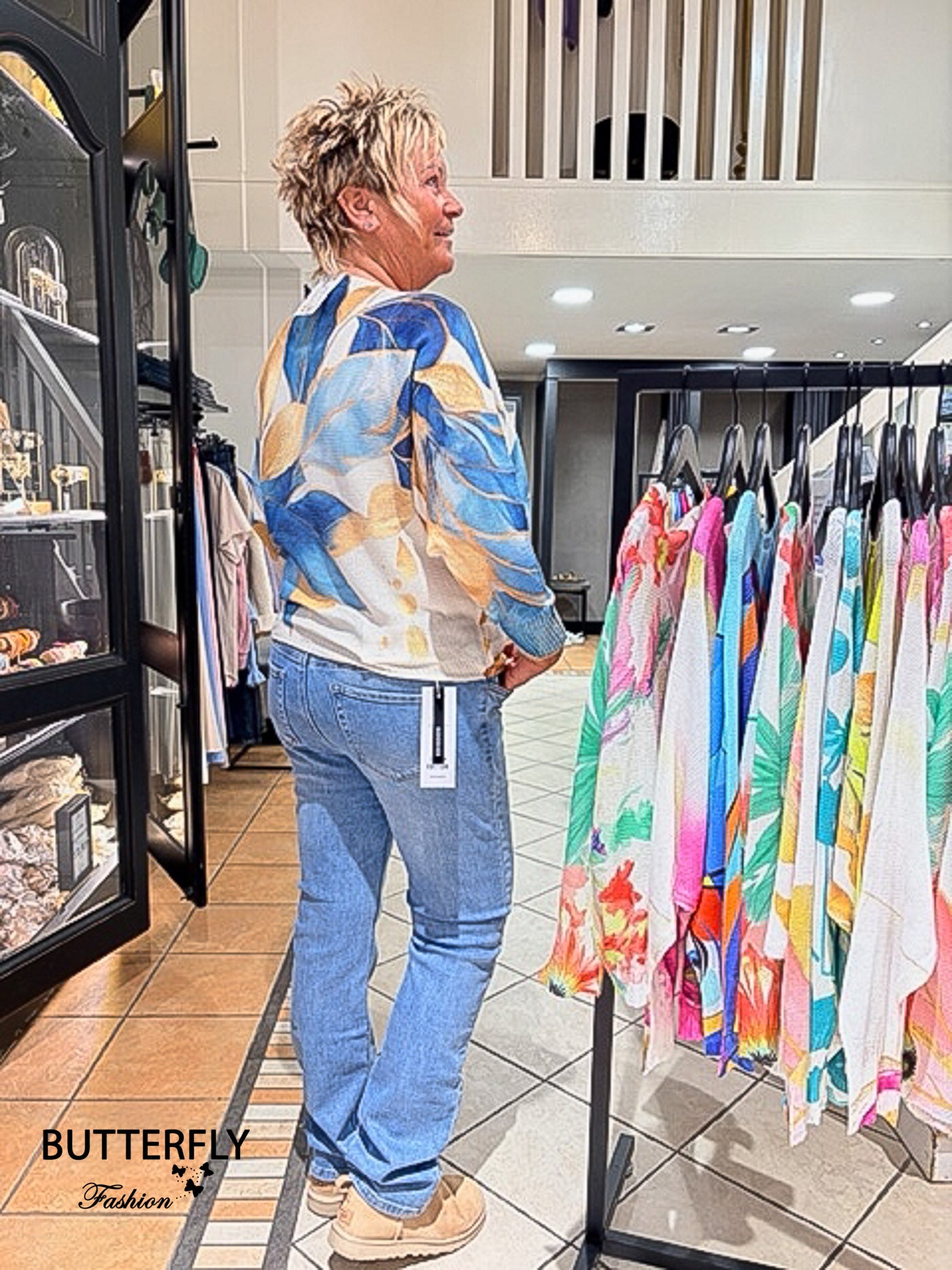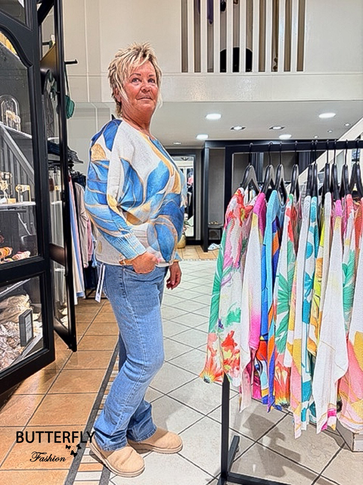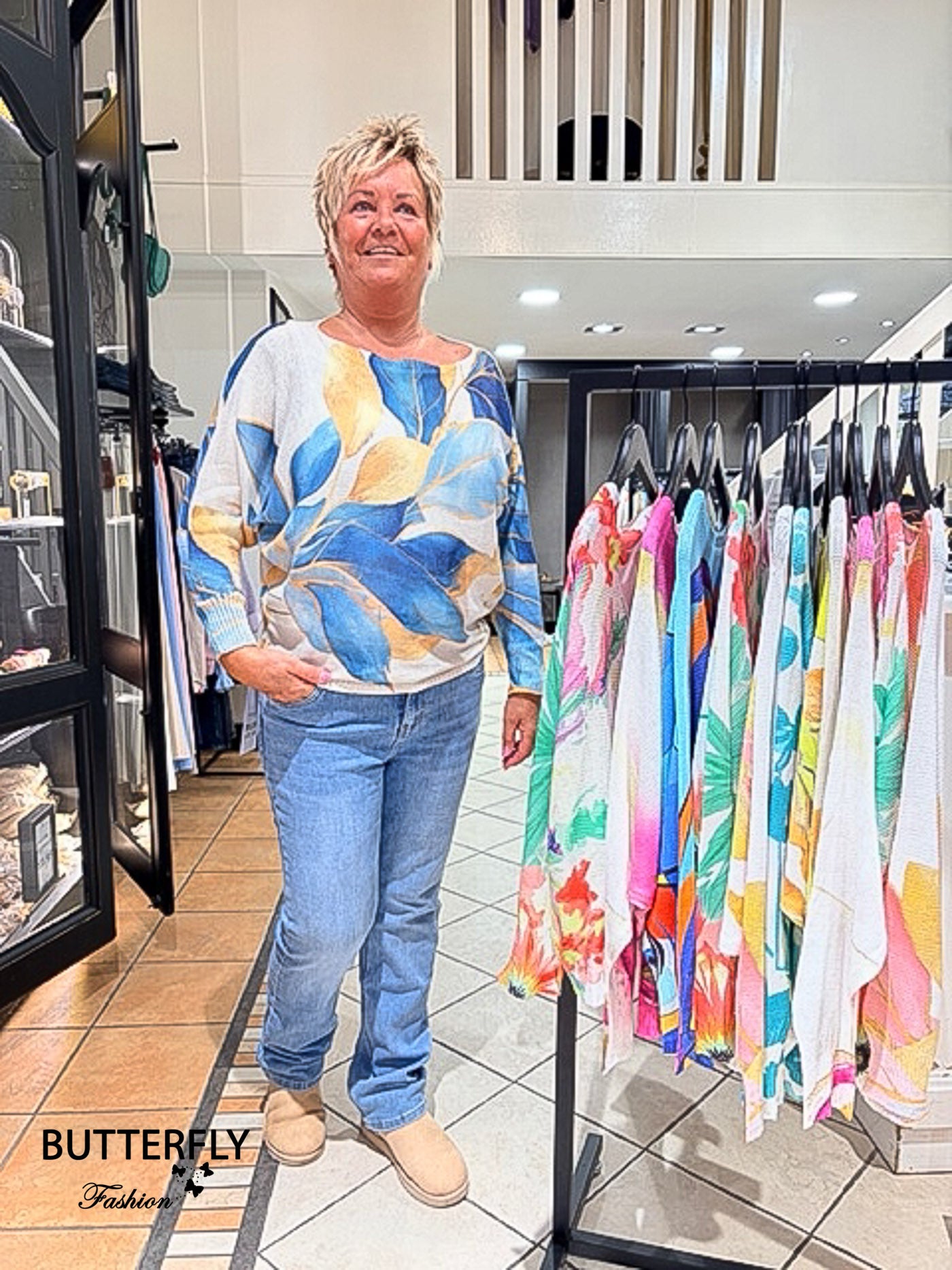 Leuke voorjaarstrui in vrolijke kleurtjes. Deze trui heeft een vleermuis mouw en een mooie boothals.