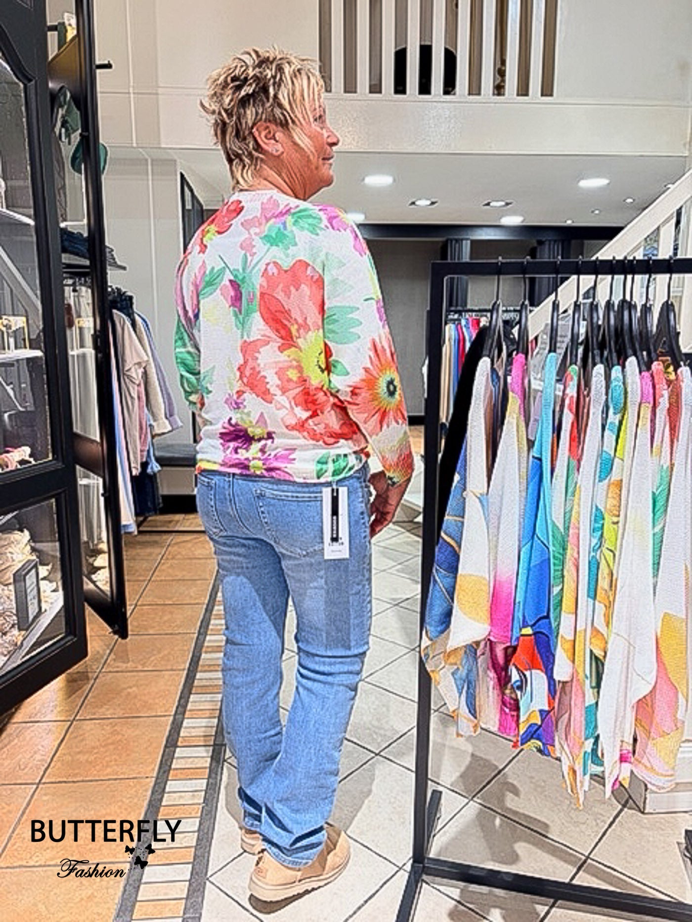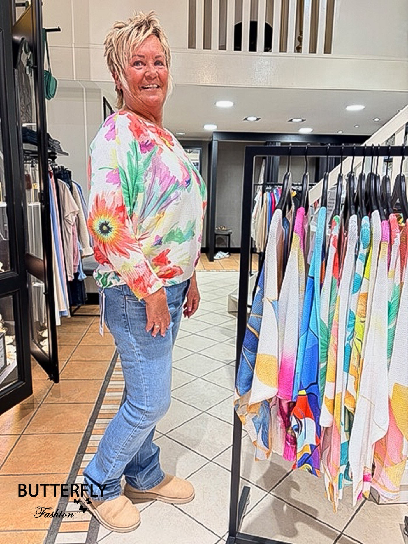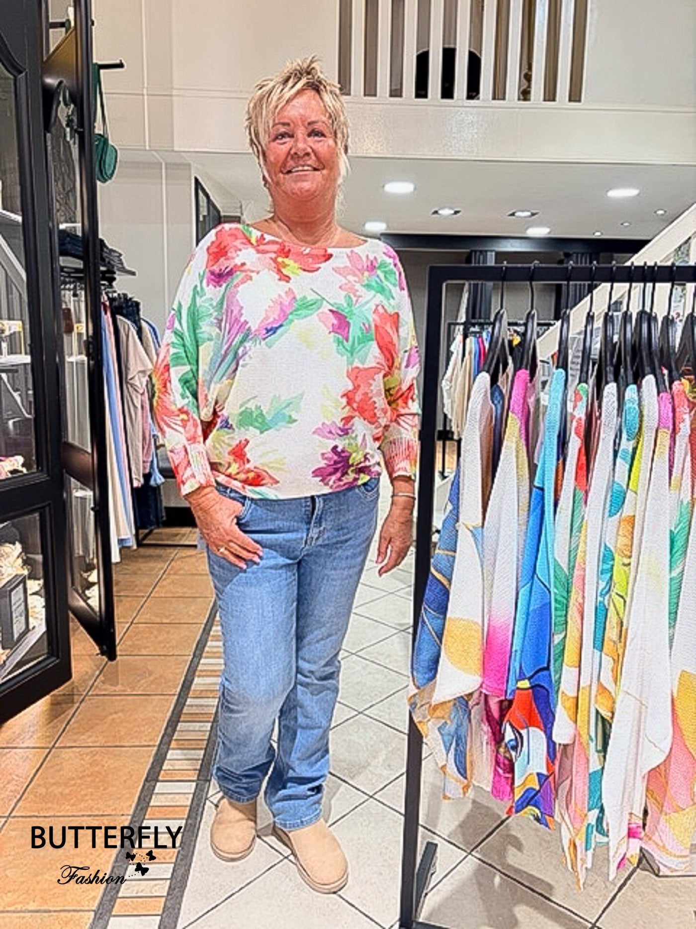 Leuke voorjaarstrui in vrolijke kleurtjes. Deze trui heeft een vleermuis mouw en een mooie boothals.